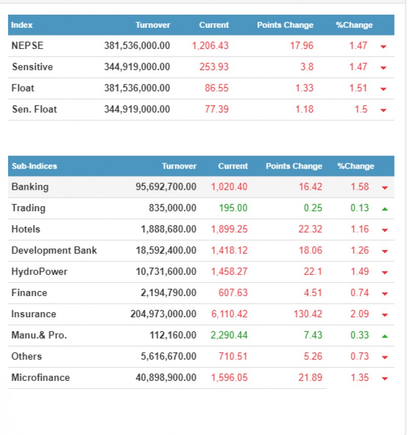 काठमाडौँ, शेयर बजार आज पनि दोहोरो अंकले ओरालो लागेको छ । नेपाल स्टक एक्सचेञ्जका अनुसार आज नेप्से परिसूचक १८।३३ बिन्दुले ओरालो लागेर एक हजार २०६ बिन्दुमा आइपुगेको छ ।