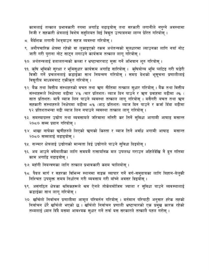 यस्तै उनले अर्थतन्त्रलाई दलालतन्त्रको कब्जा र भ्रष्टाचारबाट मुक्त गर्ने अभियान सुरु गर्न पनि सरकारसँग माग गरेका छन्।