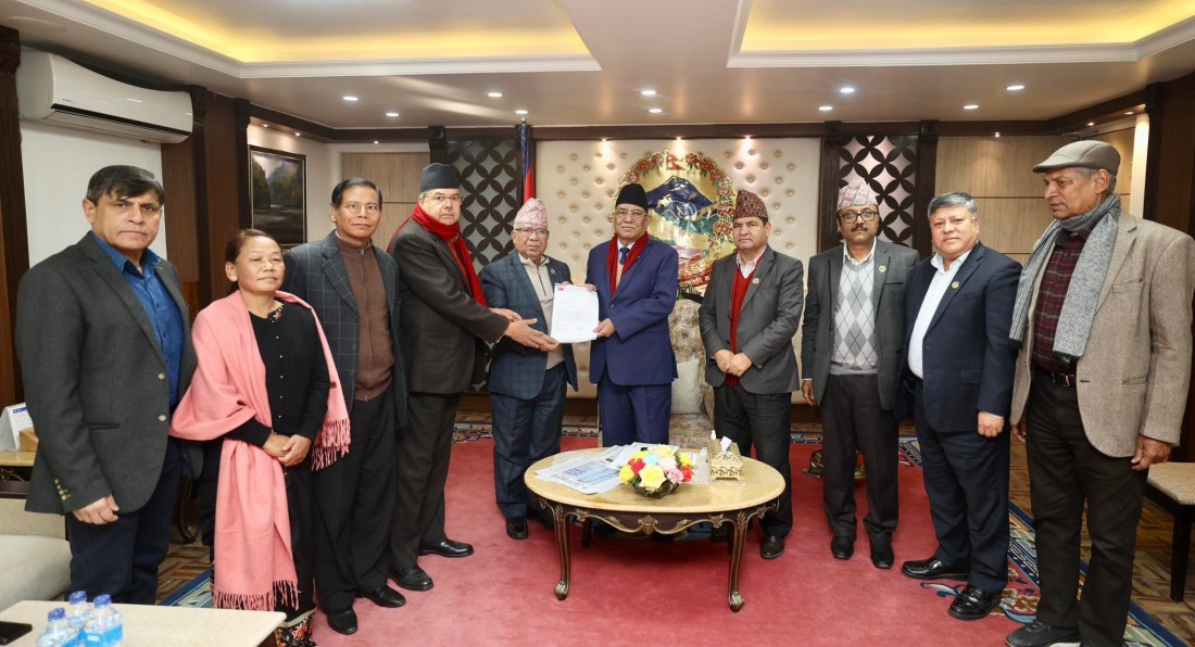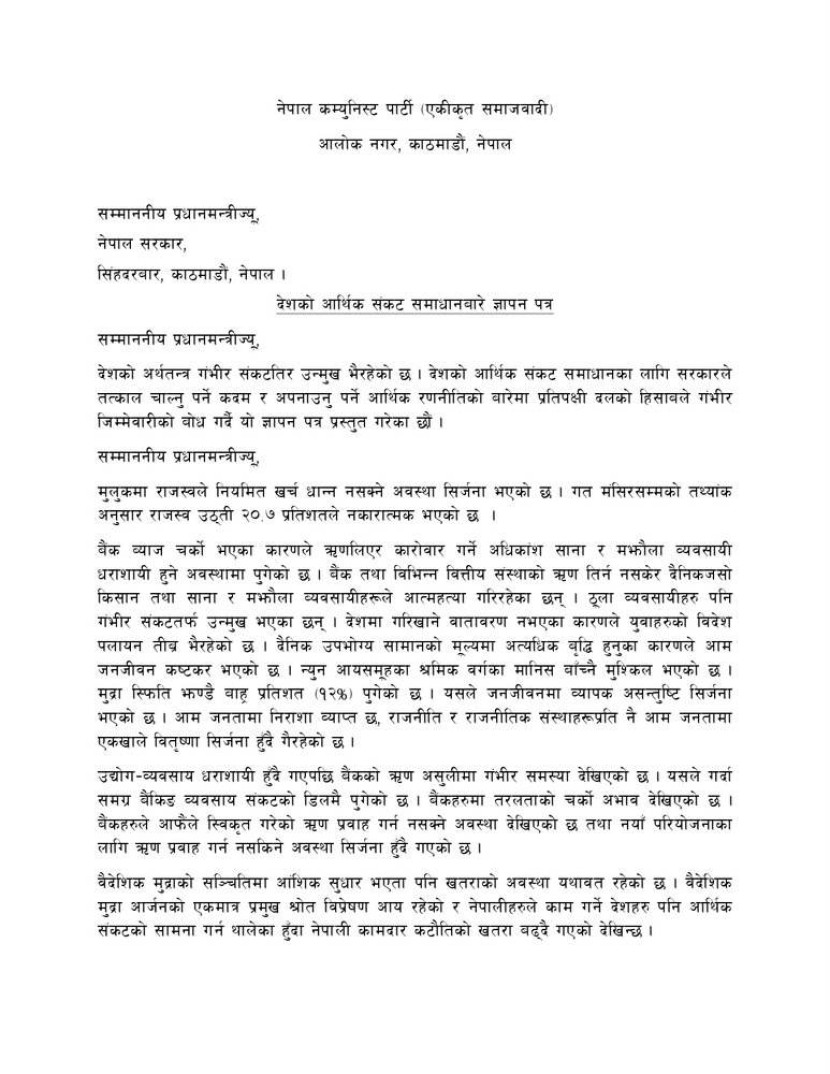 काठमाडौं, नेकपा (एकीकृत समाजवादी)ले प्रधानमन्त्री पुष्पकमल दाहाल ‘प्रचण्ड’लाई ज्ञापन पत्र बुझाएको छ । देशको आर्थिक सङ्कटबारे मङ्गलवार बिहान पार्टी अध्यक्ष माधवकुमार नेपाल सहितको टोलीले प्रधानमन्त्री प्रचण्डलाई २० बुँदे सुझावसहितको ज्ञापन पत्र बुझाएका हुन् ।